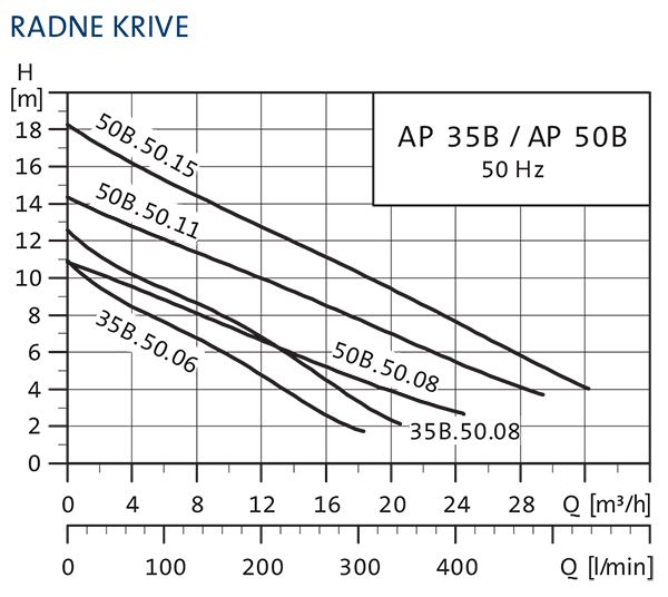 Unilift AP Basic pumpe su jednostepene pumpe (AP35B, AP50B) sa vortex rotorom. Sve Unilift AP Basic pumpe su napravljene od nerđajućeg čelika sa kompozitnom donjom pločom. Asortiman Unilift AP Basic pumpi predviđen je za potapajuću upotrebu, bilo kao slobodno stojeće pumpe na osnovnoj ploči ili kao instalirane pomoću auto-spojnice. Usis pumpe je napravljen tako da spreči da velike čestice prodru u pumpu. Osnovna ploča je pričvršćena pomoću četiri kopče koje su sakrivene ispod kompozitnog prstena na vrhu kućišta pumpe. Ovaj prsten sprečava da se prljavština zalepi za kopče. Sve Unilift AP Basic pumpe mogu biti isporučene sa plutajućim prekidačem ili bez njega, za automatsko ili ručno upravljanje. Pumpe sa slovom ”A” u oznaci tipa imaju plutajući prekidač. Ispust se nalazi na boku pumpe i on je R 2.