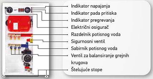 Dodaj u korpuIMPRO električni blok kotao namenjen je za zagrevanje poslovnih, stambenih i proizvodnih prostora, i najveću primenu ima u uslovima ograničenog prostora gde ne postoji priključak za gas ili neku drugu vrstu grejanja. Elektro kotao Impro sa svojim malim dimenzijama, kompaktnom konstrukcijom i kvalitetnom izradom predstavlja idealan izbor za komforno grejanje, koji se sastoji od cirkulacione pumpe, ekspanzione posude i još čitavog niza sigurnosne opreme i automatike. IMPRO električni kotlovi se izrađuju u rasponu od 6 do 36kW instalisane snage u varijantama jednocevnog, dvocevnog radijatorskog razvoda i u varijanti višekružnog podnog sistema grejanja. Kotlovi za jednocevni i podni sistem grejanja su opremljeni sabirnikom i razdelnikom sa ventilima za balansiranje grejnih krugova. Upravljanje električnim blok kotlom je automatski regulisano preko stepenastog kotlovskog radnog termostata. Svaka grejačka grupa se uključuje preko zasebnog kontaktora što daje mogućnost izbora angažovane snage. Ovakav režim uključivanja doprinosi većoj ekonomičnosti i uštedi potrošnje električne energije. Kontrola rada IMPRO elektirčnog blok kotla je veoma jednostavna i komande za upravljanje radom električnog blok kotla, kao i indikatori prisustva napona, pregrevanja i pada pritiska se nalaze na komandno-kontrolnoj tabli.
